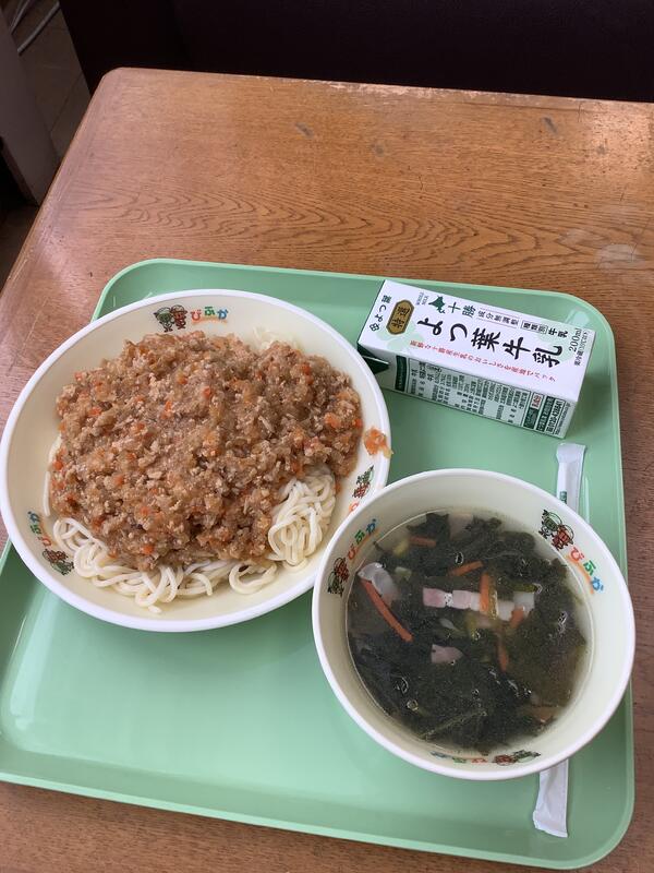 今日のメニューは和風肉みそスパゲティとほうれんそうスープ!