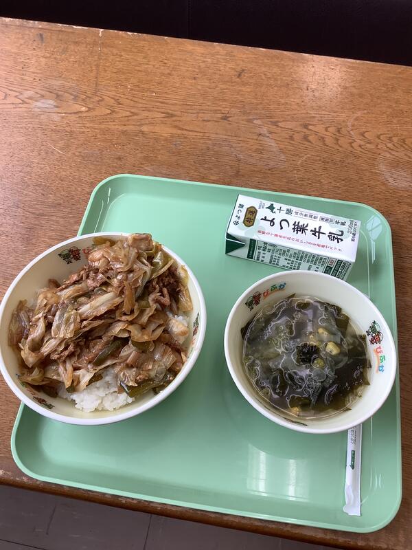 キムチスープがここ最近の給食を思い浮かべても大当たりのメニューでした!例えるなら、スタミナ丼の具材をすべてキムチスープにぶち込みました!的な。もしくは、あなたのために一人用のチゲ鍋作っちゃいました!的な。この例えからめちゃくちゃ豪勢だったことが伝わってほしいです。もう具材がたっぷり。食べても食べてもなくならない。スープを飲んでると言うよりは野菜をもぐもぐ食べている感覚に近いです。やっぱりこれ一人鍋です。しいたけ、にら、白菜、にんじん、しめじ、豚肉、とうふが入っていたみたいです。やっぱりこれチゲ鍋です。うますぎましたもん。元気付きすぎますって。キムチだからって辛くはないんです。キムチラーメンみたいなノリでピリッとはするけどそれ以上に独特の深みを醸し出しています。キムチとニラの相性が抜群すぎて、匂いが濃いコンビがとにかくスープを奥深くしています。午後が心配になること以外欠点のない完璧なスープでした。