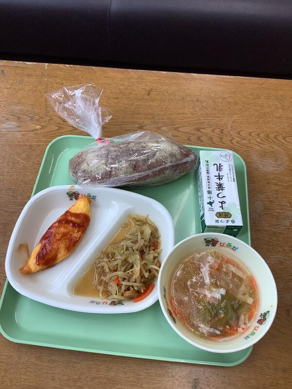 今日のメニューはきな粉揚げパン、レタススープ、オムレツのソースがけ、そしてもやしのカレー炒め!